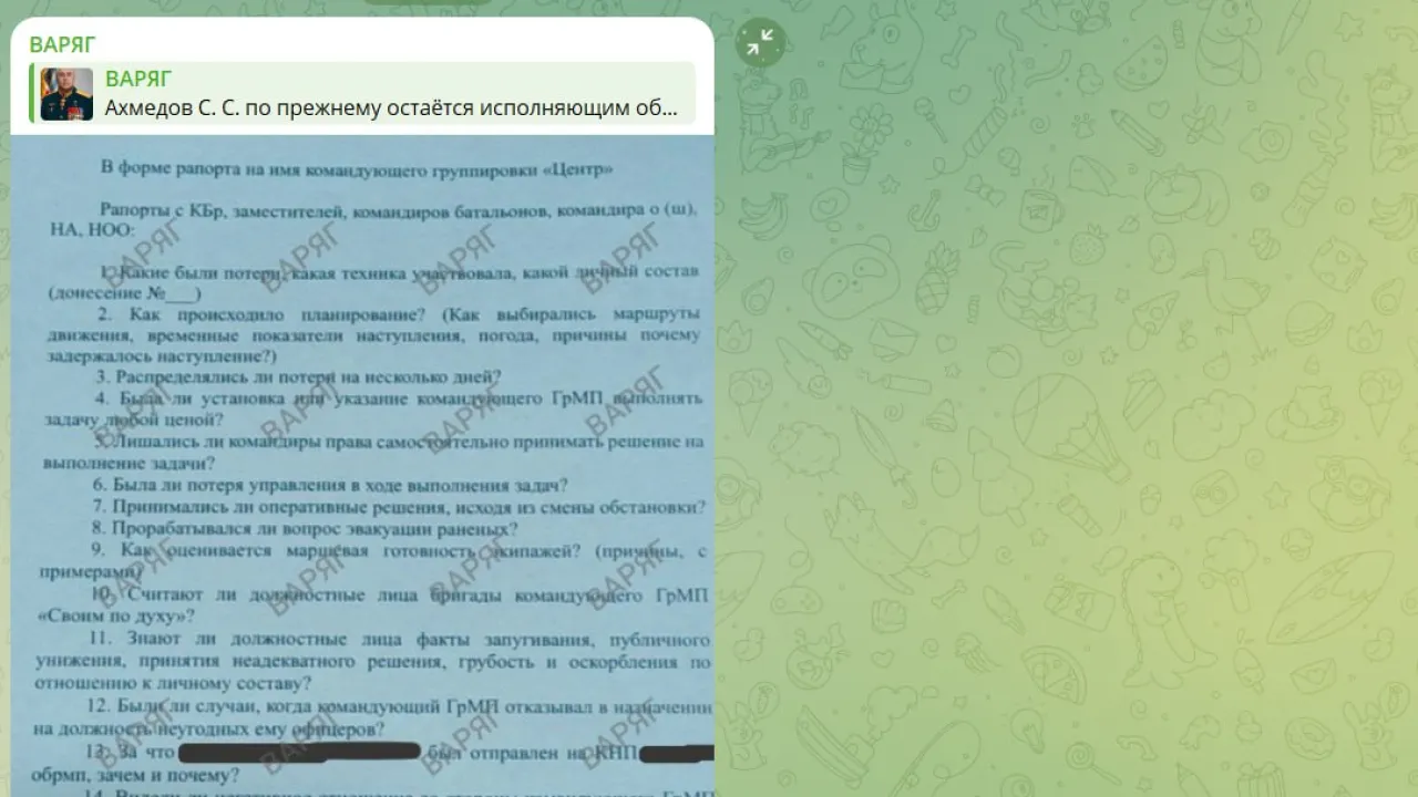 Как сообщает военный тг-канал "Варяг", генерал-лейтенант Ахмедов хотя и отстранен от командования, но командовать продолжает. По данным "Варяга", с середины января он был оставлен в должности на две недели как "исполняющий обязанности". "Варяг" рассказывает почему: