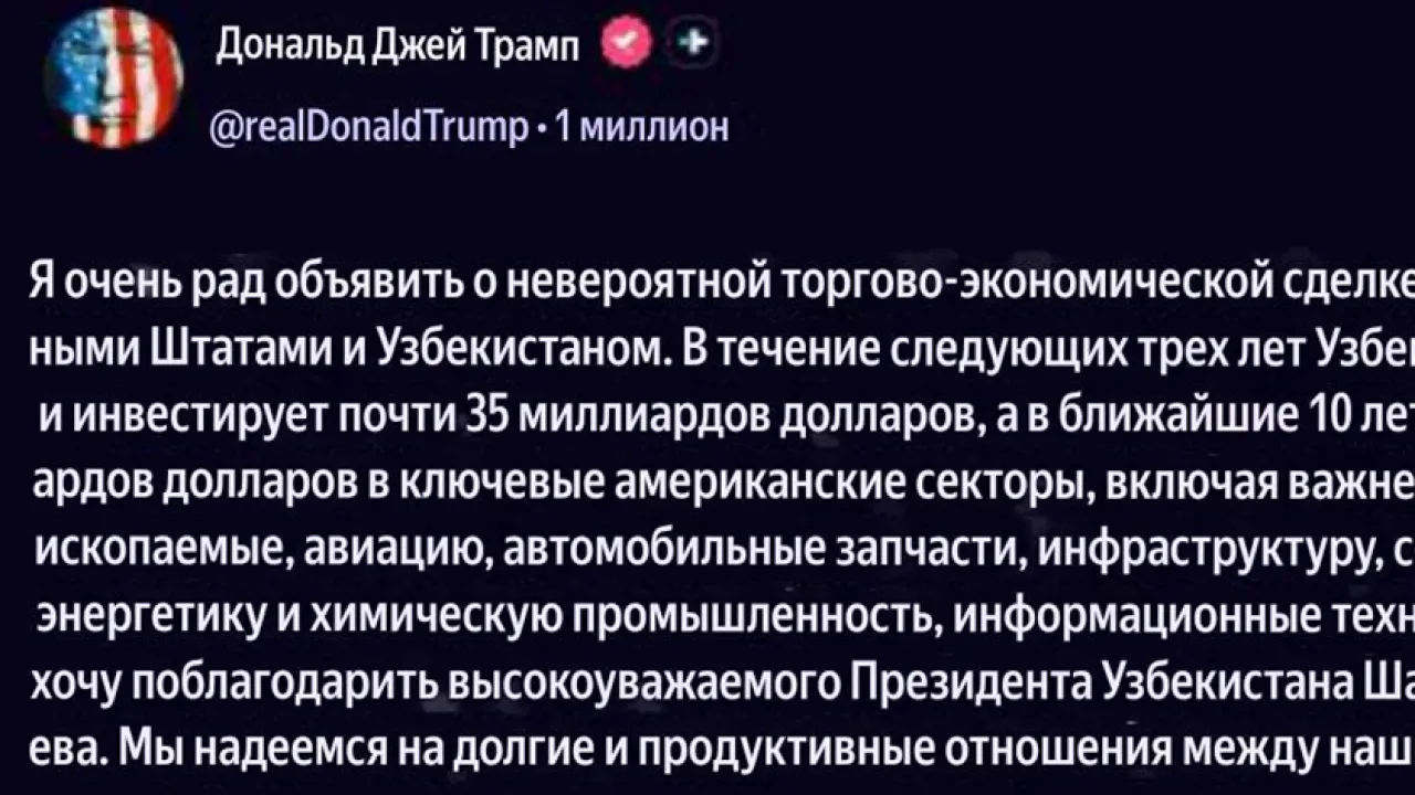 Еще интереснее получилось с Узбекистаном, который недавно отменил визы для граждан США. Трамп – большой любитель больших натуральных чисел – по итогам саммита заявил, дескать, в ближайшие годы Узбекистан направит 35 миллиардов долларов на закупки в ключевых американских отраслях, а за последующее десятилетие вложит еще 100 млрд долларов в американскую экономику.