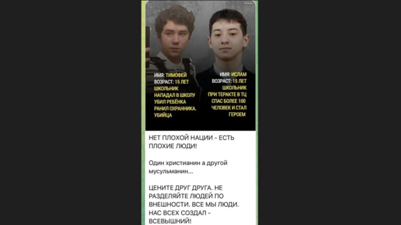 В частности, известный дагестанский комик Омар Алибутаев распространял фейк, будто отец Тимофея (который совершил убийство) – член "Русской общины". А скандальный блогер из Казани Расул Тавдиряков, которого допрашивали в качестве свидетеля по делу о финансировании ИГИЛ*, выложил провокационную картинку. Тимофей там назван христианином, что неправда, поскольку на фото у него языческий символ. Дескать, мусульмане – герои, как мальчик Ислам, помогавший людям во время теракта в "Крокусе", а вот Тимофей был христианином, и этим всё сказано.