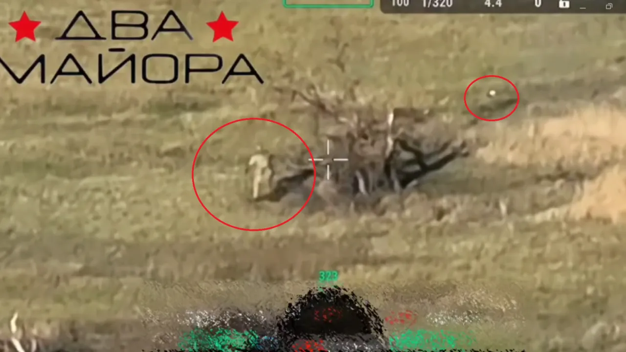 Сначала солдат убегал от дронов, потом нашёл укрытие за сухими кустами. Но и там пришлось уклоняться. Дроны падали в шаге от бойца и взрывались, но не задевали его. Русский солдат всякий раз поднимался на ноги. Пару дронов отбил большой корягой.
