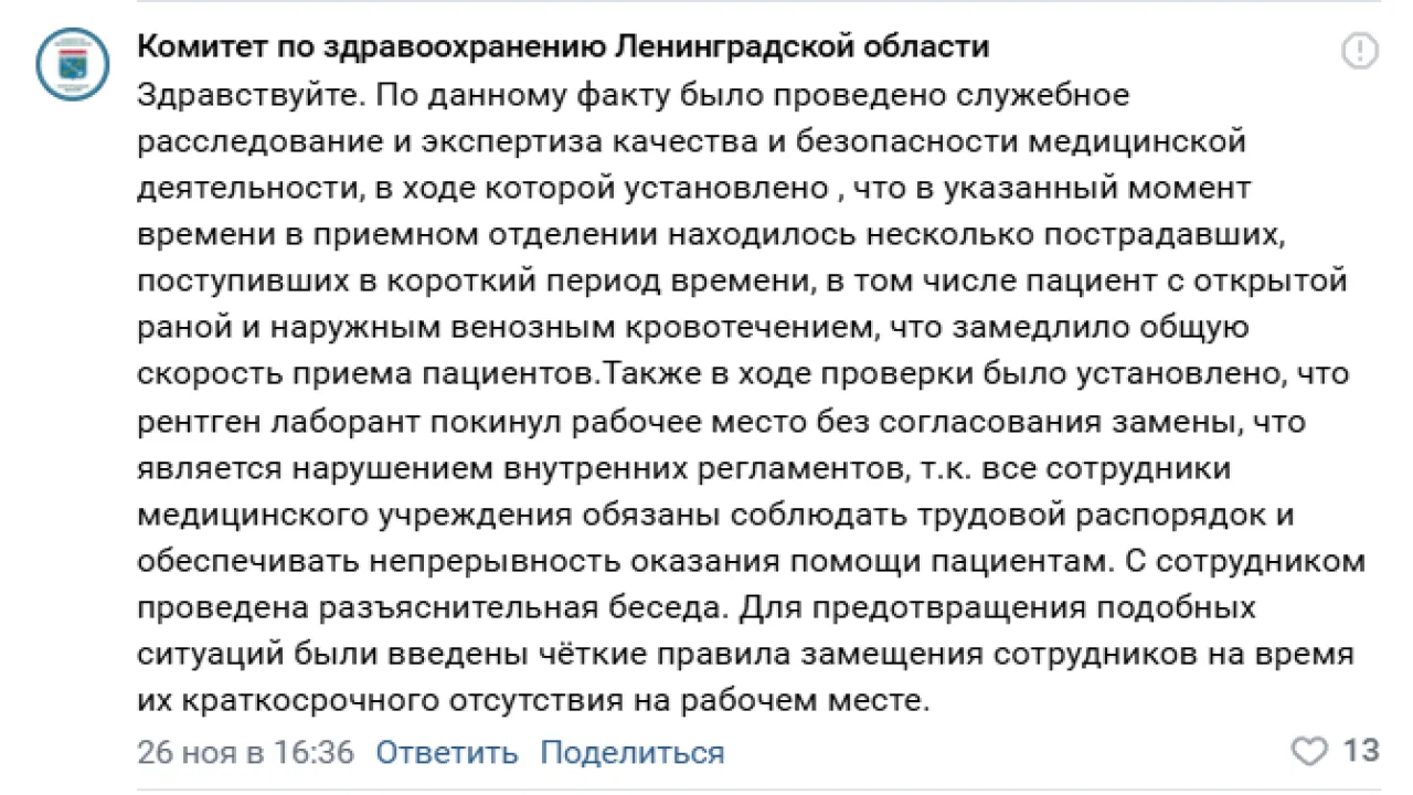 Разрешить конфликт с религиозным подтекстом попытался комитет по здравоохранению Ленобласти. Но, пожалуй, сделал ещё хуже. Чиновники подтвердили факт отлучки врача и добавили, что в тот момент в приёмном отделении были пострадавшие, в том числе – с открытой раной и венозным кровотечением. И тут же, как и руководство больницы, заявили о введении правил замещения сотрудников на время их краткосрочного отсутствия на рабочем месте.