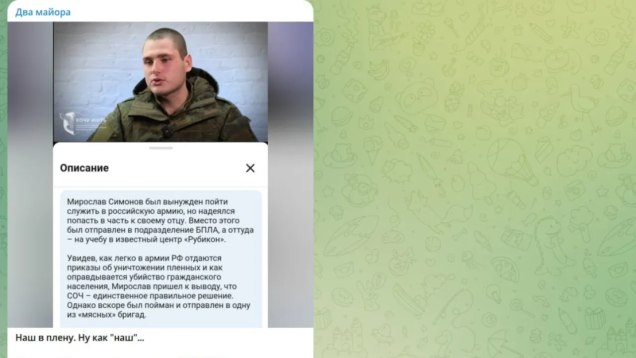 Красок в портрет перебежчика добавил военно-аналитический канал "Два майора". По данным канала, Симонов "бежал целенаправленно, инициативно выйдя на противника". А отец предателя продолжает воевать в составе ВС России. "Два майора" отмечают: Мирославу после СОЧ и задержания Родина уже предлагала искупить вину: вместо лишения свободы ему дали шанс в штурмовиках. Но после его выступления во вражеских СМИ об искуплении не может быть и речи: перебежчику грозит огромный срок за измену Родине и добровольную сдачу в плен. Авторы канала насмешливо пишут: