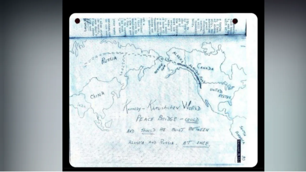 Внезапно, после общения двух лидеров один из ключевых русских переговорщиков Кирилл Дмитриев в социальной сети раскрыл часть данных из советских документов о Джоне Кеннеди. Был опубликован фрагмент карты, на котором от руки ручкой нарисована схема пути, соединяющего Чукотку с Аляской, и надпись на английском: "Мост Кеннеди-Хрущёва можно и нужно построить между Аляской и Россией немедленно". Как пишет "КП", документ является частью письма гражданина США Дага Сандстрема, которое тот отправил на имя Никиты Сергеевича в связи с убийством Кеннеди.
