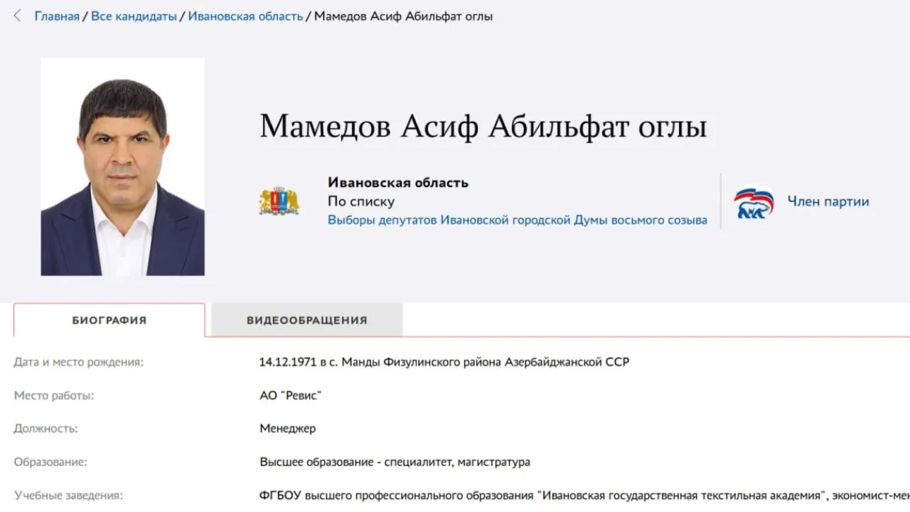 Предстоящие выборы в городскую думу принесут жителям Иваново в качестве представителя их интересов в муниципальном парламенте… главу местной азербайджанской диаспоры. По спискам от "Единой России", сформированным в результате предварительного голосования, на выборы идет Мамедов Асиф Абильфат Оглы. Председатель национально-культурных автономий азербайджанцев Ивановской области и города Иваново, уроженец села в Физулинском районе Азербайджанской ССР.
