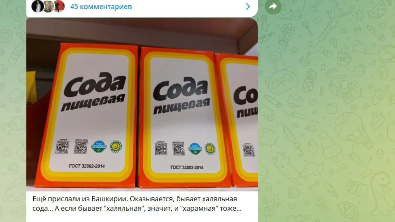 Оказывается, бывает халяльная сода... А если бывает "халяльная", значит, и "харамная" тоже. Местные башкиры и татары в шоке. Так скоро "халяль" будут вешать на ложки и спички...