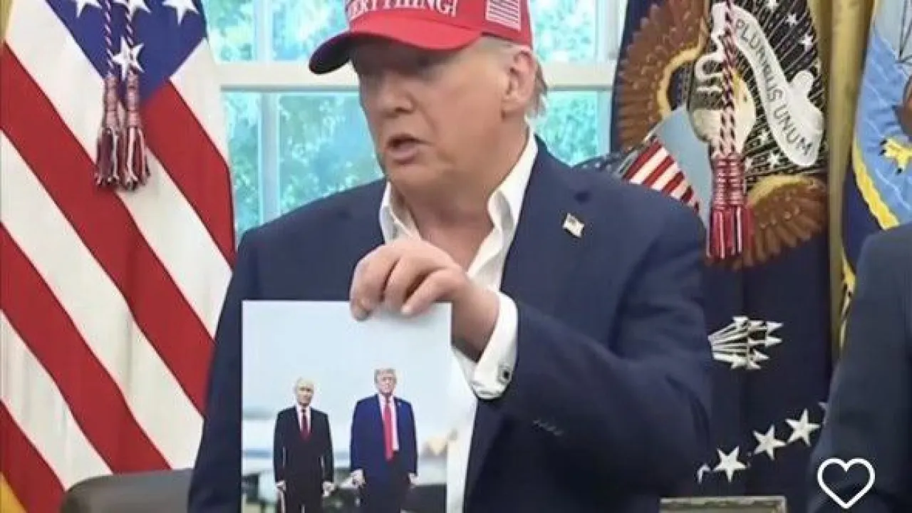 Трамп во время заявления показал прессе фото с Путиным: "Он здесь хорошо выглядит". Скрин видео.