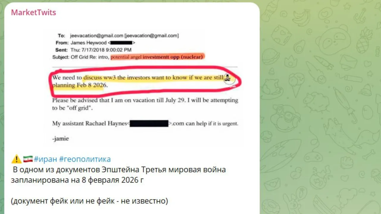 СМИ облетела новость, что в материалах дела Джеффри Эпштейна было найдено письмо, в котором упоминается "вероятность начала Третьей мировой войны". Утверждается, что некоторые потенциальные инвесторы якобы намеревались обсудить этот вопрос.
