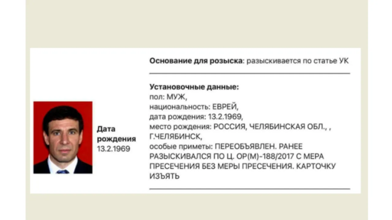 В сентябре прошлого года МВД России "переобъявило" беглого экс-губернатора Челябинской области и олигарха Михаила Юревича. Ориентировка появилась в полицейской картотеке. В ориентировке указано, что розыск ведется по уголовному делу, но вменяемой статьи не значится. И мера пресечения не указана. Что было дальше, читайте в материале "Новороссии".