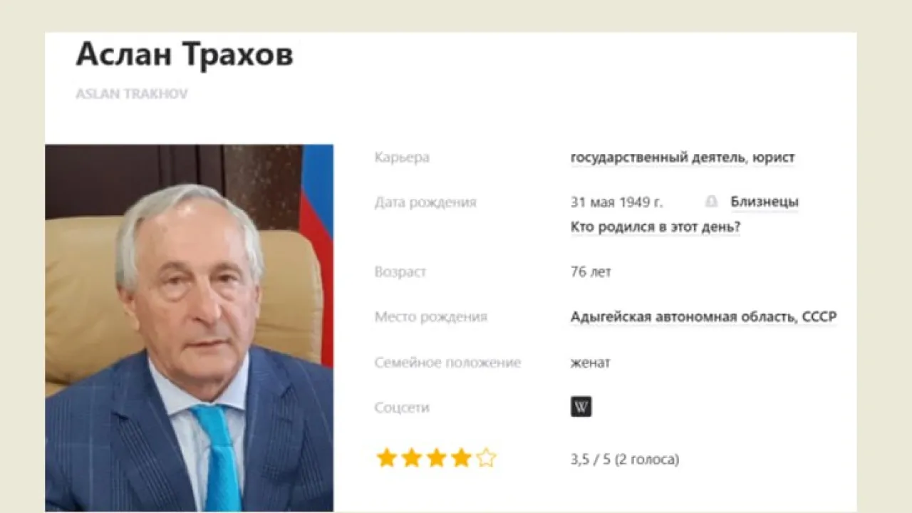 Аслан Исмаилович Трахов – личность в Адыгее известная. Начинал в 70-е рядовым следователем, но быстро пошел вверх по служебной лестнице. Зам районного прокурора, районный прокурор, министр юстиции республики Адыгея, зампредседателя республиканского Верховного суда. С февраля 1998 года по май 2019 года – председатель Верховного суда Адыгеи.