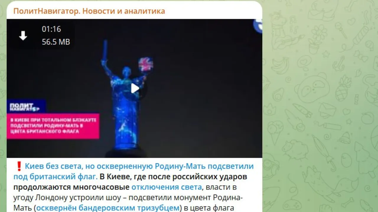 Добьётся ли она выполнения распоряжения от всех губернаторов, которым его разослала? Ответ пришёл из Киева, где власти устроили шоу, достойное отдельного психиатрического разбора. Циничность такого решения властей просто зашкаливает: город почти круглые сутки без света, но на подсветку монумента "Родина-Мать" в цвета флага Великобритании электричества не пожалели.