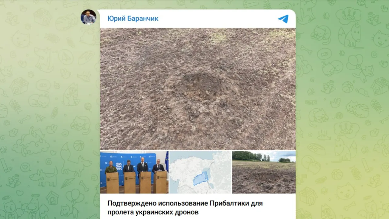 И тут выяснилось, что в Эстонии потерпел крушение боевой БПЛА. Телеграм-каналы публикуют фото: воронка, куски корпуса, след от взрыва. Генеральный директор Службы внутренней безопасности Марго Паллосон признала: