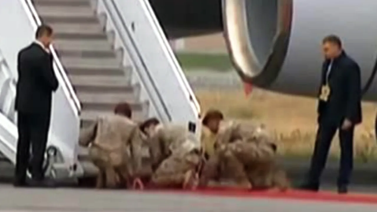 На самом деле они присели на корточки, поправляли красную дорожку перед прилетом лайнера. Но выглядело это именно как встреча на коленях, от чего украинские комментаторы поначалу сильно опешили.