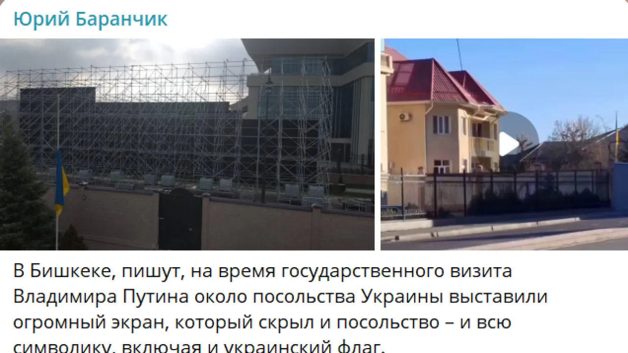 Посольство Украины в Бишкеке расположено рядом с резиденцией президента Киргизии "Ынтымак Ордо" – всего в 200 м. На время мероприятий с участием президента России Владимира Путина напротив здания установили огромный LED-экран.
