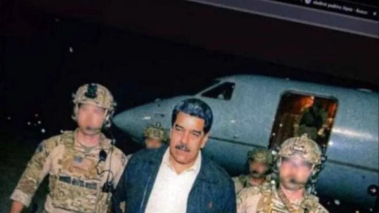 В сети активно распространяется якобы первое фото Николаса Мадуро, похищенного спецназом США и вывезенного из страны. Президента Венесуэлы держат за руки два человека в военной форме, на заднем фоне – самолёт, время – ночь.