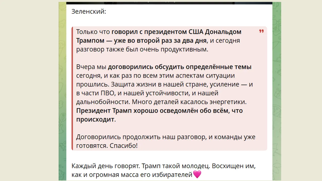 Кроме того, Трамп и его собеседник обменялись мнениями по поводу Запорожской АЭС и ожидаемо сошлись на том, что её следует передать под контроль Киева ради безопасности всего мира. О том, что "ради безопасности" хорошо бы перестать обстреливать её силами ВСУ, речь, насколько можно судить, не шла.
