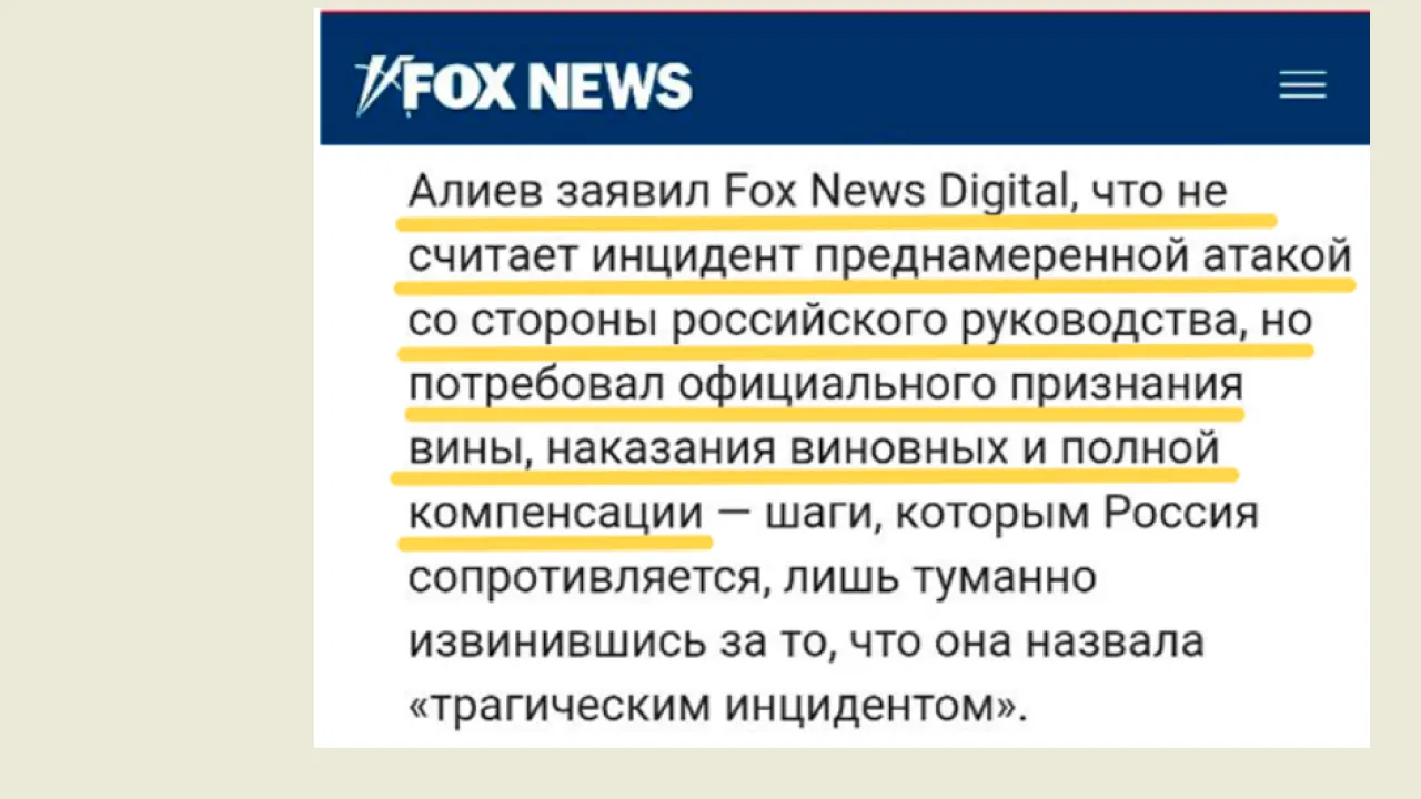 Когда уже было известно о встрече президентов на Аляске, американский канал Fox News выдал комментарий Алиева по расследованию крушения азербайджанского лайнера. Он сказал впервые, что считает атаку на самолет со стороны России непреднамеренной. А ведь раньше обвинял нас в провокации.