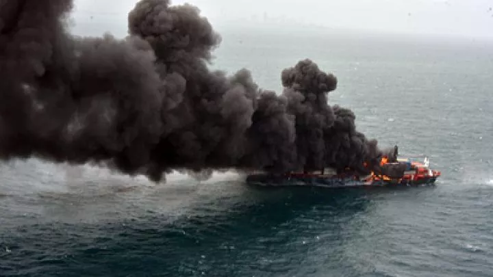В подтверждение авторы публикации выложили фото. На нем виден пришвартованный корабль, из которого столбом идет дым.