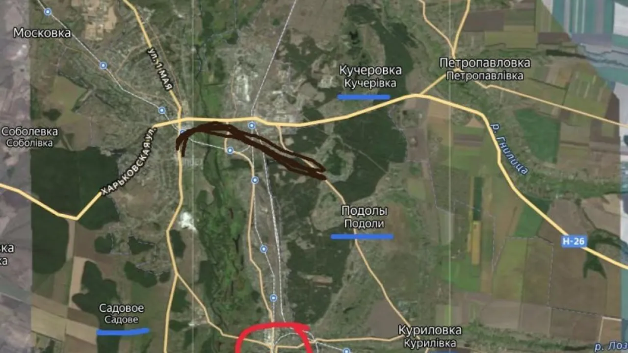 Красным обозначен Купянск-Узловой, а синим — населённые пункты, которые, мягко говоря, не совсем под нашим контролем. Жирная чёрная линия (не красная) обозначает границу, до которой есть визуальное подтверждение контроля ВСУ,