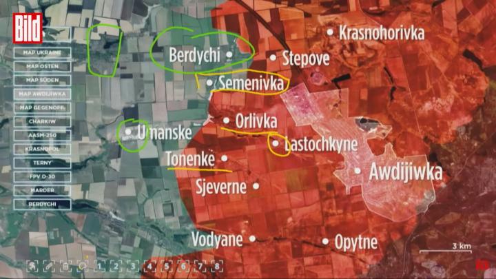 Он заявляет, что русские войска уже местами прорвали украинскую линию обороны к западу от Авдеевки по селам Бердычи - Семеновка - Орловка - Тоненькое. Бои еще длятся за Бердычи и Семеновку, но их уже частично контролирует Россия, подчеркивает Репке.