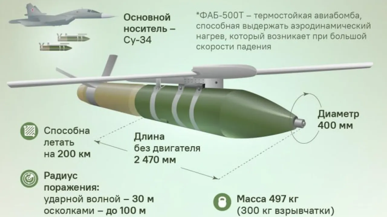 По данным из Генштаба противника, русские теперь использует авиабомбы, способные поражать цели на расстоянии до 200 км. Речь идет о новом универсальном планирующем боеприпасе (УМПБ):